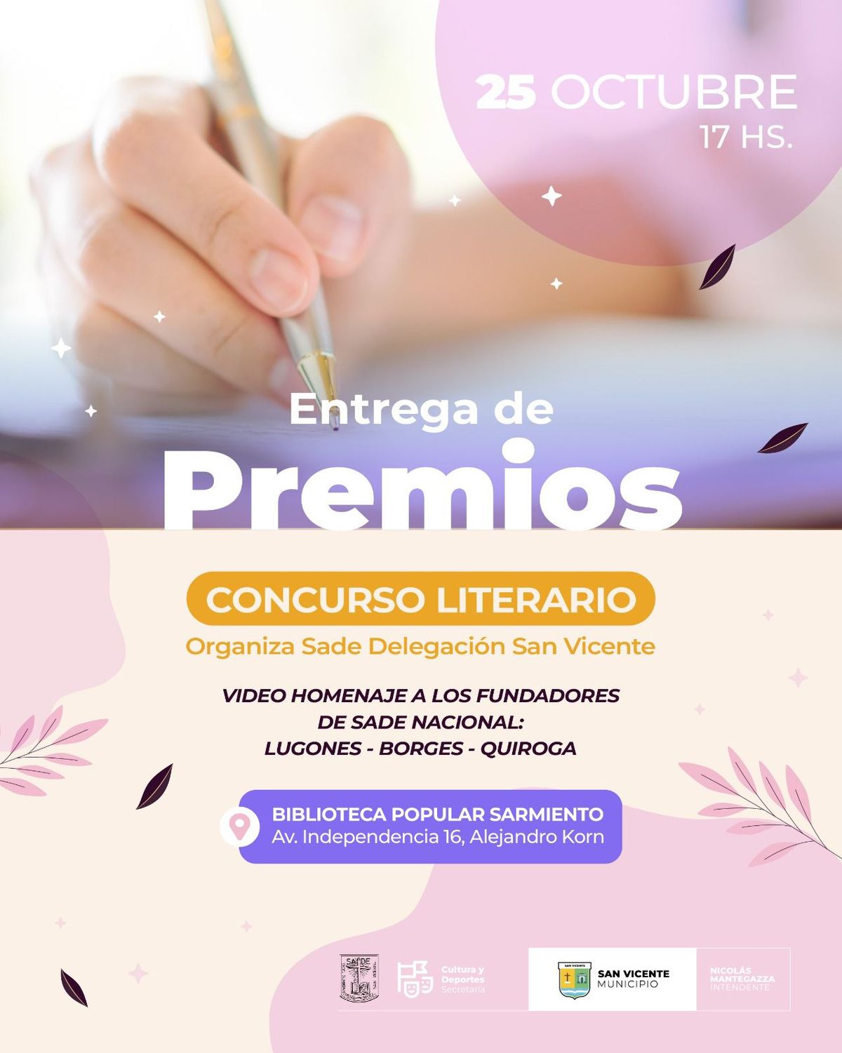 La Biblioteca Popular Sarmiento de Alejandro Korn (Independencia 16) será el punto de encuentro el sábado 25 desde las 17 horas, con un homenaje a Borges, Lugones y Quiroga. Durante la jornada, se entregarán los premios del Concurso Literario de San Vicente en las categorías “Poesías Mayores”, “Cuentos Mayores” y “Cuentos Juveniles”, celebrando el talento de los escritores y escritoras locales.
